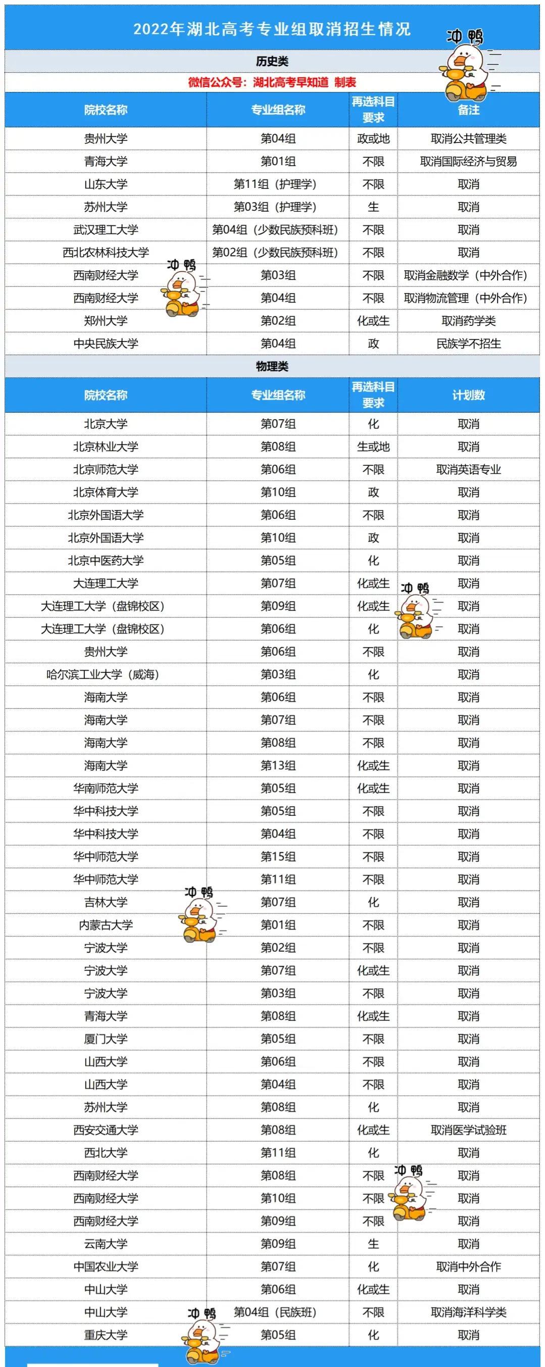 从表格中可以看出:2022年物理类取消的专业组比较多,虽然取消了某专业组招生,但是也有新增的专业组;今年不少的院校取消了大类招生。历史类中山东大学、苏州大学的护理学专业组,今年不招生了,少数民族预科班也有院校取消招生。
