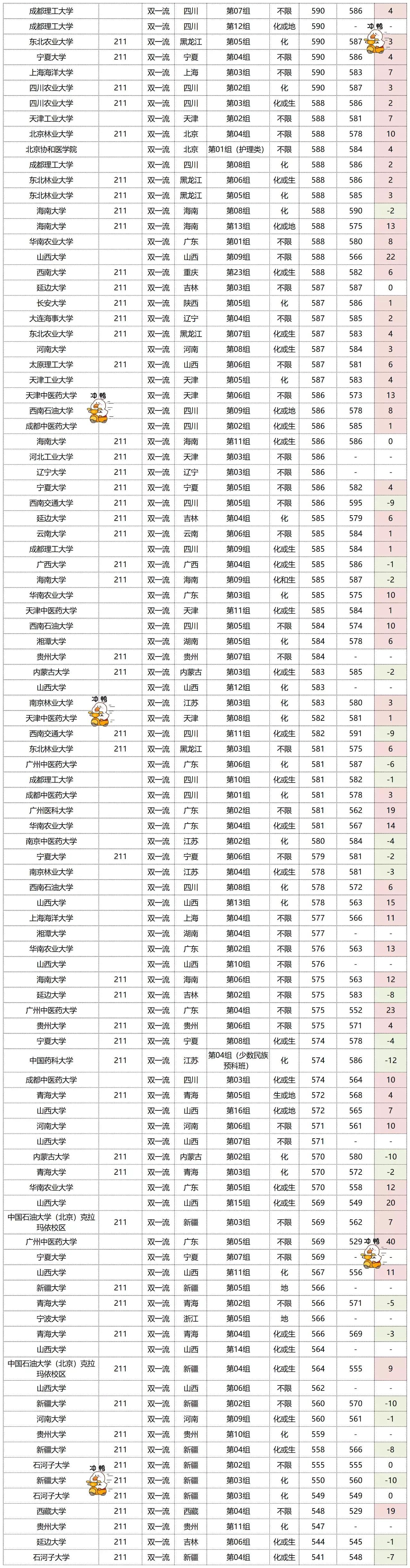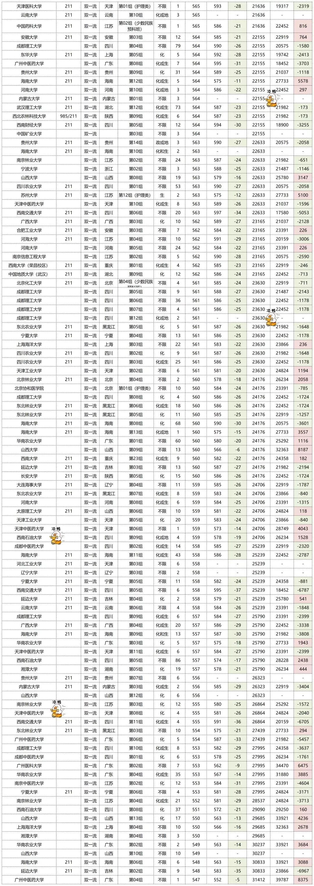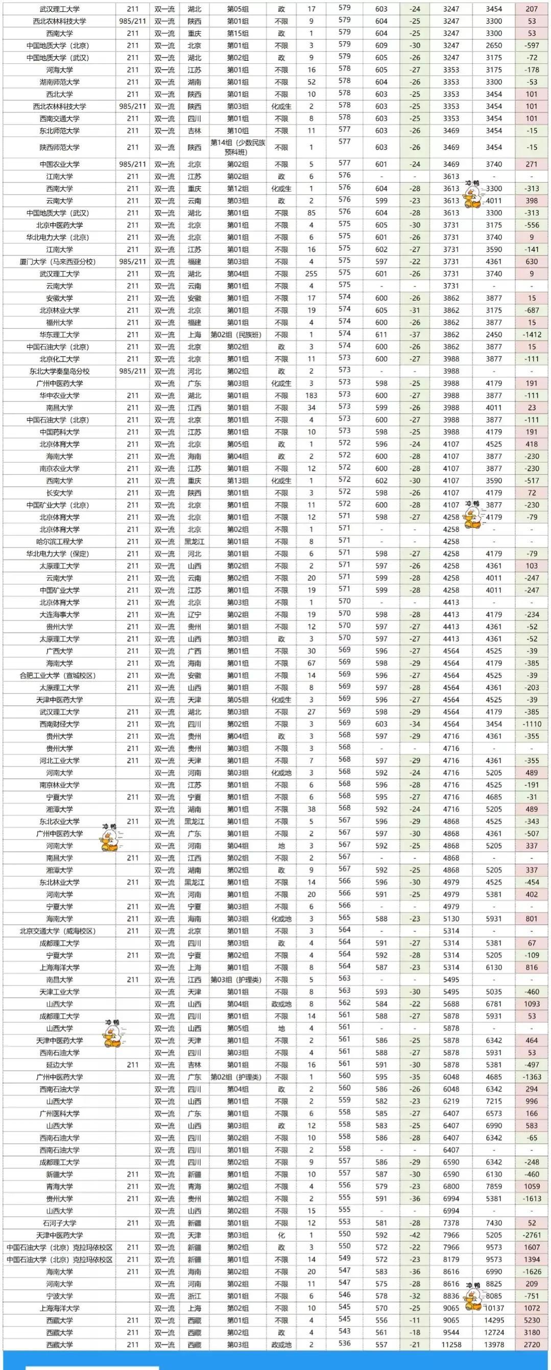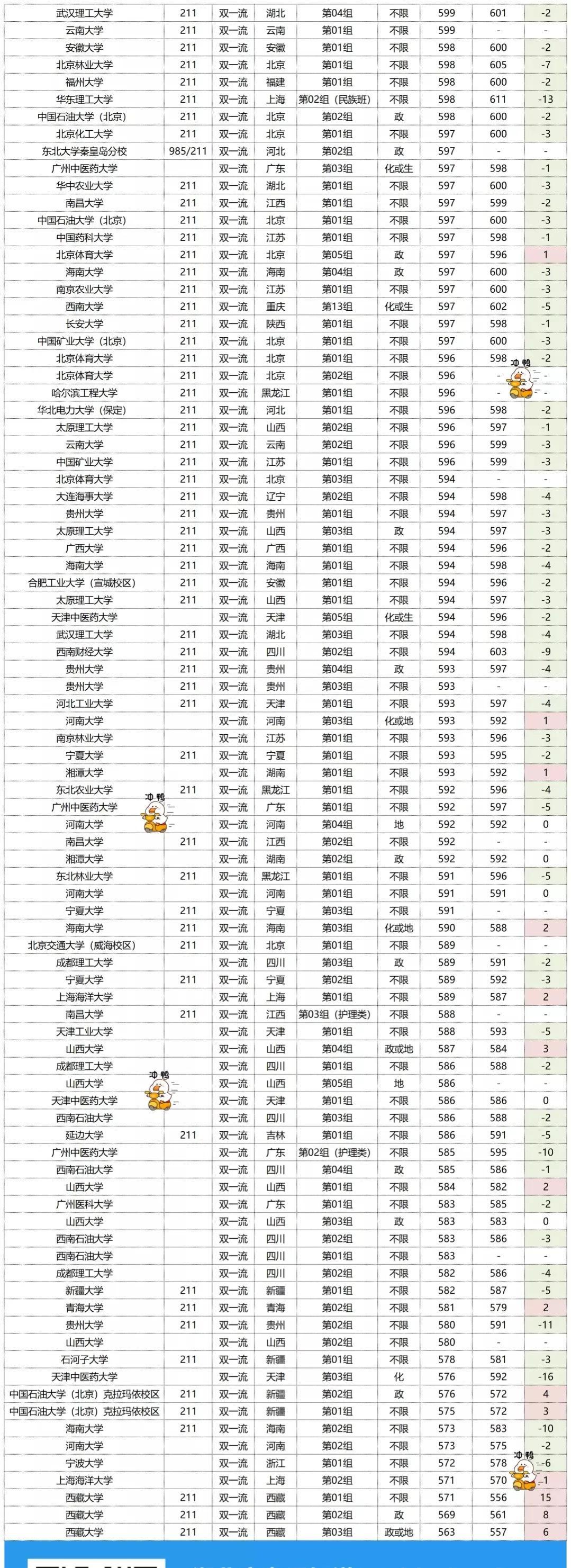 投档线整体都下降了,排名也呈下降趋势。投档线下降最多的是天津中医药大学的“第03组”,下降了42分,排名也是下降最多的,下降了2761名。西藏大学的“第01组”投档线虽然下降了11分,但是排名是上涨最多的,上涨了5230名。需要注意的是:院校专业组的上涨和下降和今年的专业组内新增和取消专业也是有关的。