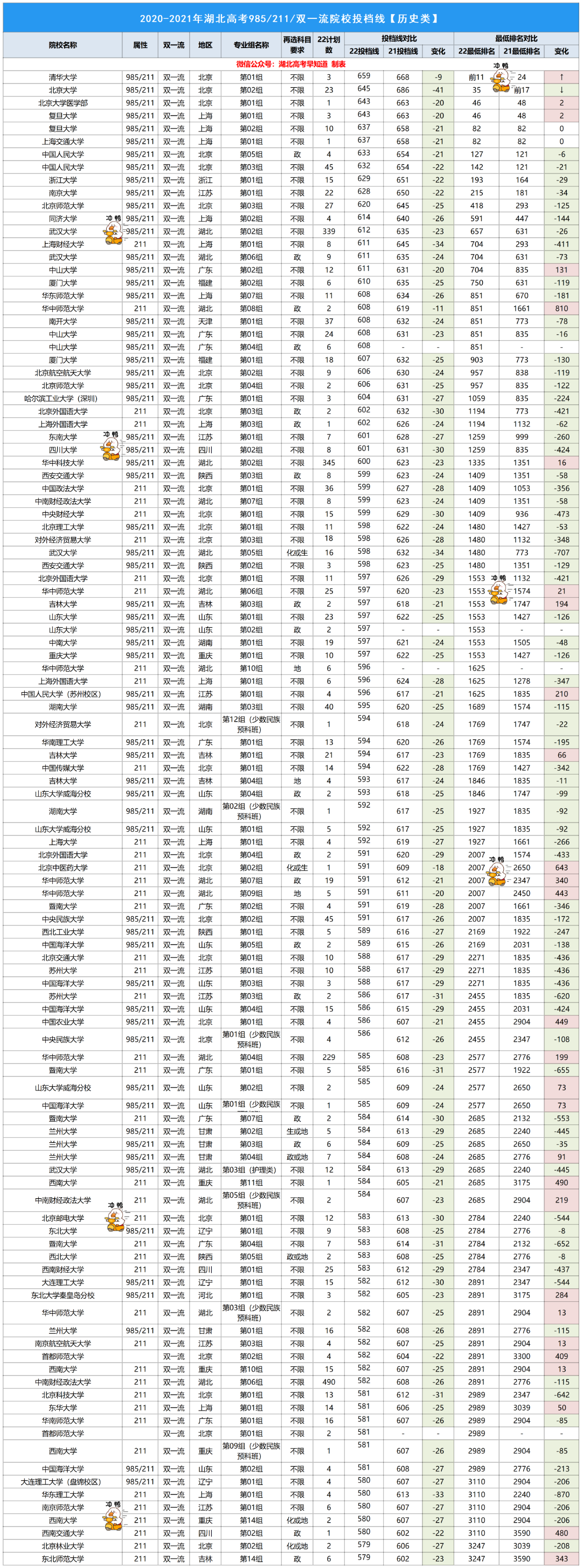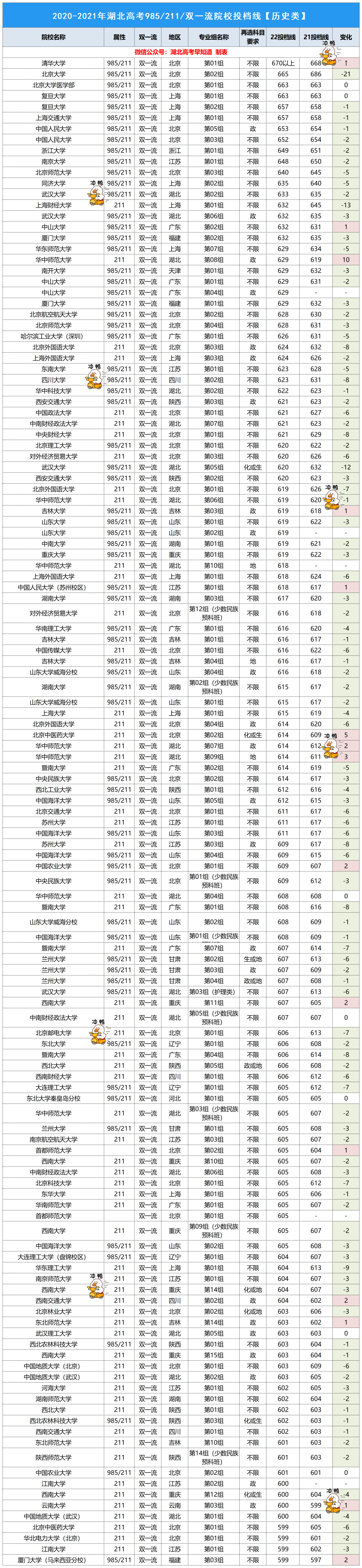 整体来看,2022湖北本科普通批【历史类】投档线呈下降趋势,今年的专业组专业和去年的多多少少有点不同,部分专业组内专业及代号做了修改。