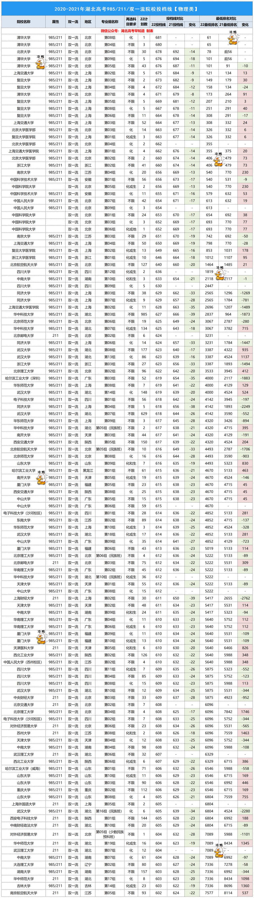 整体来看,2022湖北本科普通批【物理类】投档线呈下降趋势,今年的专业组专业和去年的多多少少有点不同,部分专业组内专业及代号做了修改。