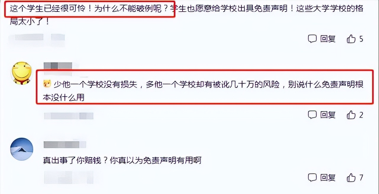 张同学在网上分享了自己的不幸经历,很快引起大众的关注。有网友表示能理解高校的做法,世事难料,一旦发生意外,学校将承担很大的风险,而且之前其他高校有过相关事件发生。