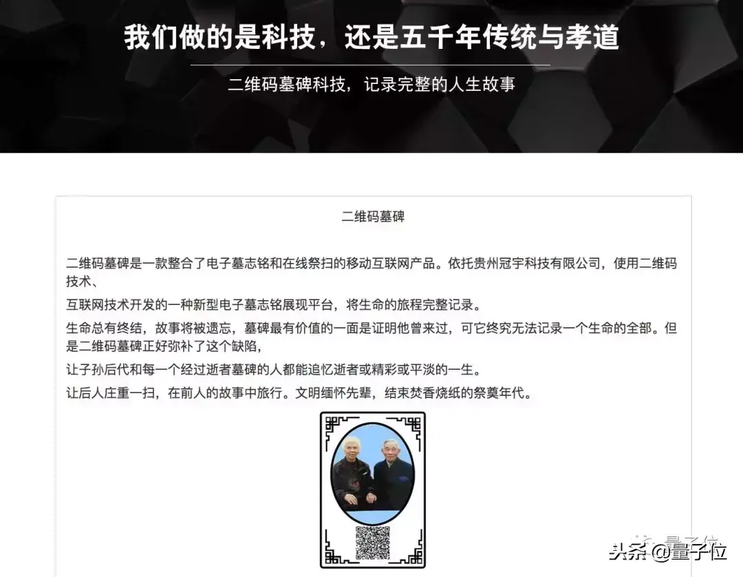 其中“二维码扫墓”一项,如此介绍——“将打造成时代发展的趋势,让普通人的‘精’、‘气’,‘神’,以及‘音’、‘容’、‘笑’,‘貌’得到永垂不朽。”