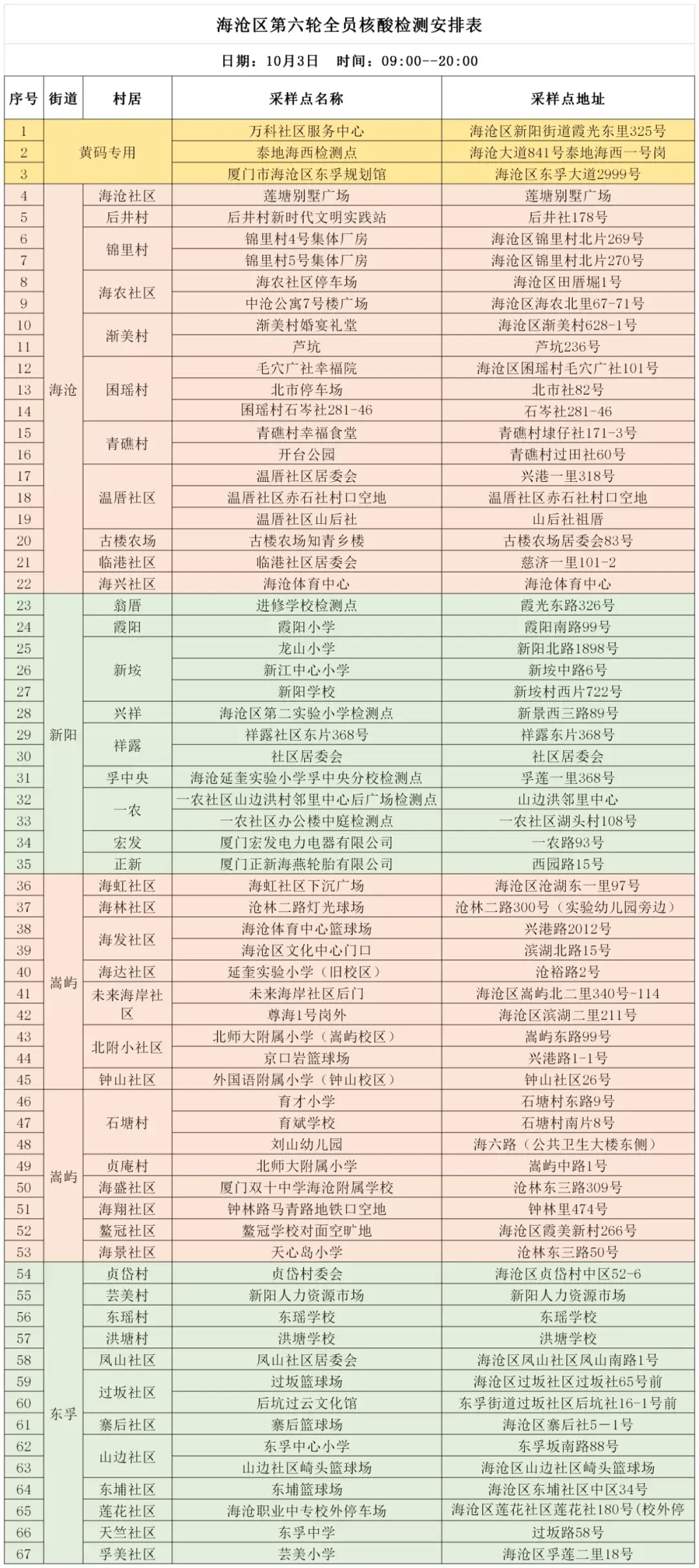 为坚决打赢疫情防控歼灭战,尽快恢复正常生产生活秩序,根据厦门市应对疫情工作指挥部统一部署,决定于2021年10月3日(周日)9:00—21:00,开展海沧区第六轮全员新冠病毒核酸检测。有关事项通告如下: