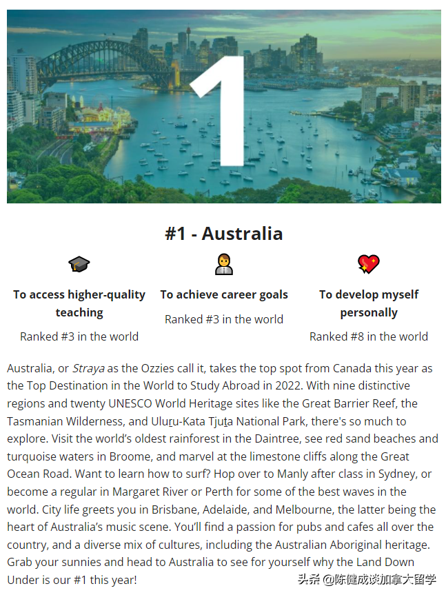 澳大利亚今年取代蝉联两年第一位的加拿大成为2022年全球最佳留学目的国首位!澳大利亚有9个独特的地区和20个联合国教科文组织世界遗产,如大堡礁和悉尼歌剧院,有很多地方值得探索。无论你想靠近黄金海岸的宁静海滩还是澳大利亚阿尔卑斯山的冒险,还是在大洋路上惊叹于石灰岩峭壁,悉尼的学生可以去曼利海滩,玛格丽特河或者帕斯,享受世界上最棒的海浪。布里斯班、阿德雷德和墨尔本澳大利亚音乐中心,你会发现这里的酒吧和咖啡厅充满激情,各种文化和谐共处,也包括澳大利亚土著文化遗产。带上墨镜前往澳大利亚,亲眼目睹为何澳大利亚是我们今年的第一。