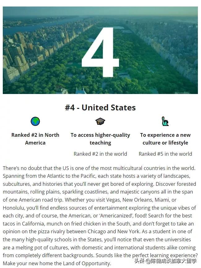 今年,我同样挑选了最佳留学国家排名的前十位中,我们传统的热门英语为主的留学国家,解读和点评一下: