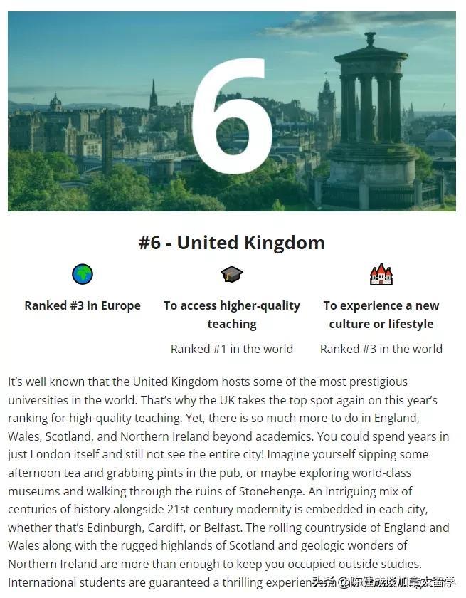 5)入围十佳的国家中,欧洲国家占6席,超过半壁江山!除英国,还有德国,法国,瑞士,荷兰,西班牙等,可能由于语种局限,有时进入不了我们的视线,所以,这个排名我们需要更加客观看待。但是如果从全世界的角度,我们不能狭隘看到只有英语的留学国家,也在提醒我们留学生在国外除了学习英语一种外语,还可以多挑战一种其他外语,如法语!
