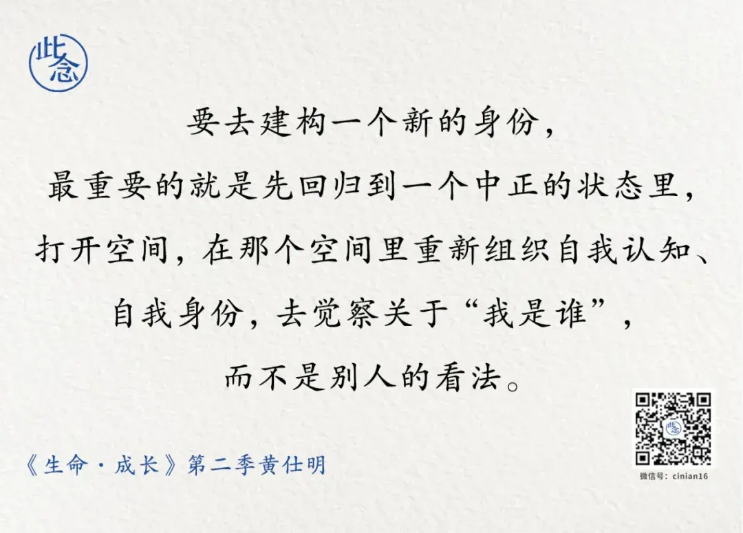 要去建构一个新的身份,最重要的就是先回归到一个中正的状态里,打开一个空间,在那个空间里重新去组织自我认知、自我身份,去觉察关于“我是谁”,而不是别人的看法。意识到这一点,开始重新认识自己,是很重要的。