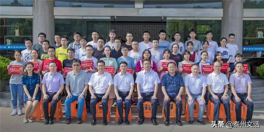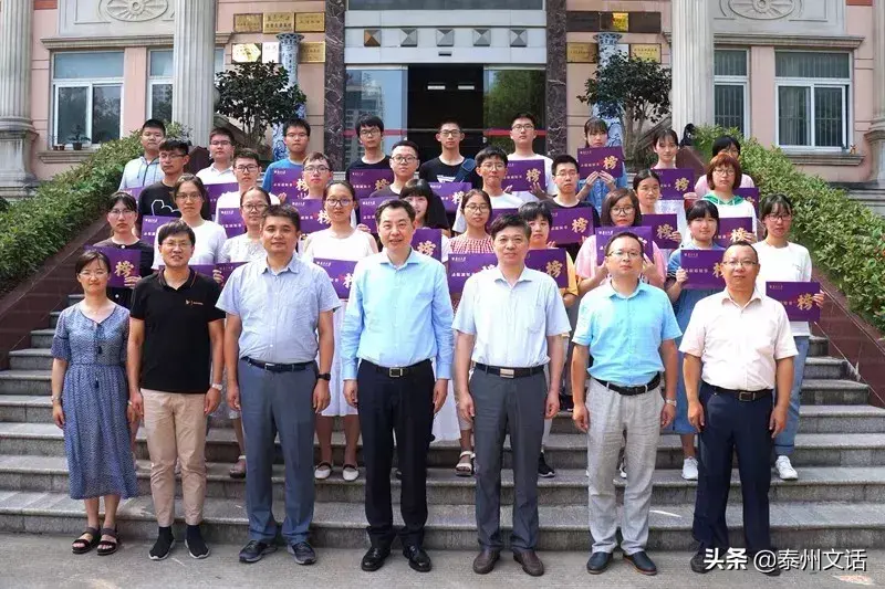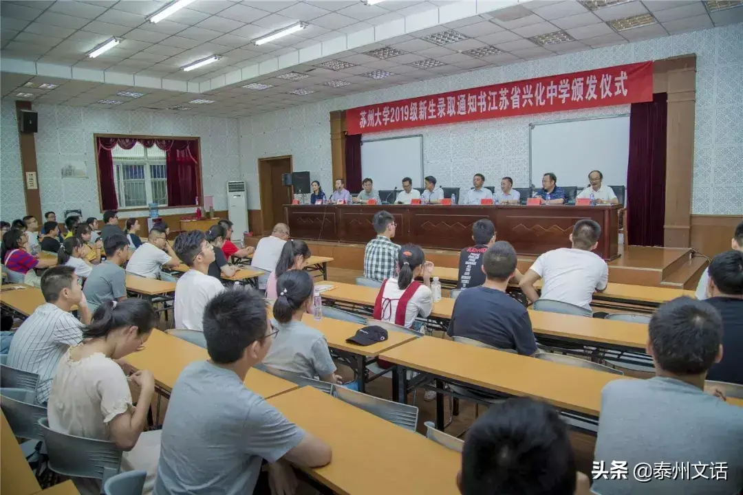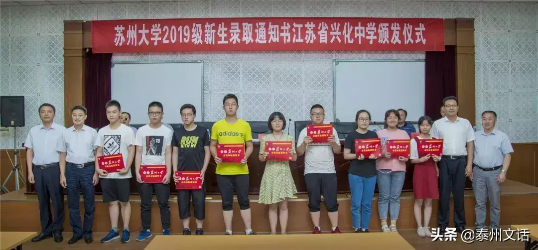 在苏州大学领导宣读2019级新生录取名单之后,又向我校赠送了录取喜报。苏州大学党委副书记邓敏,兴化市委常委、宣传部长刘春龙,兴化市教育工委书记、教育局局长张大军等领导向新生颁发录取通知书,并合影留念。