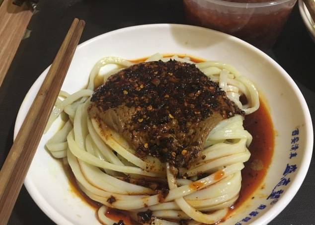 通常老板调凉皮都是用手抓一把凉皮方在油泼辣子里过一下,就这样一个过程那辣子的美味就和凉皮融为一体了。