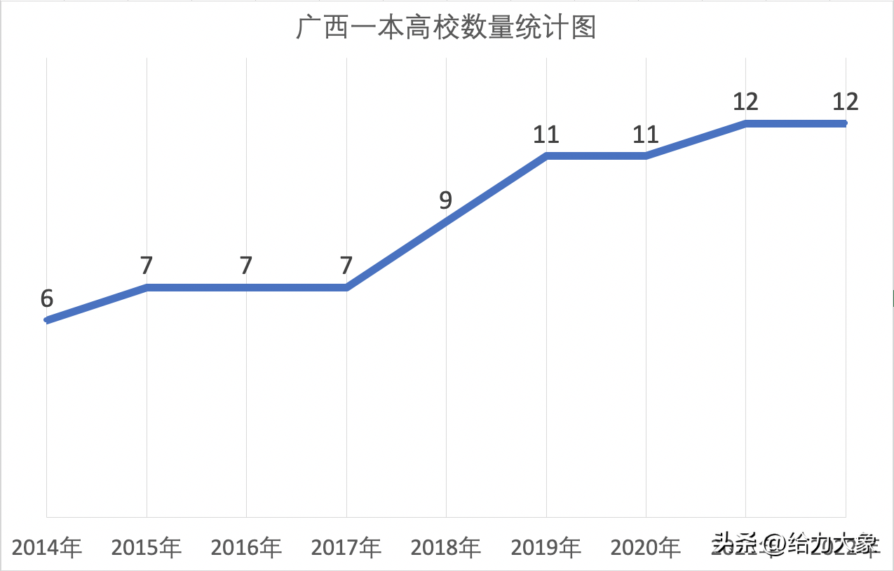 广西区内,2014年有6所一本高校,2022年有12所一本高校。8年增加了一倍。