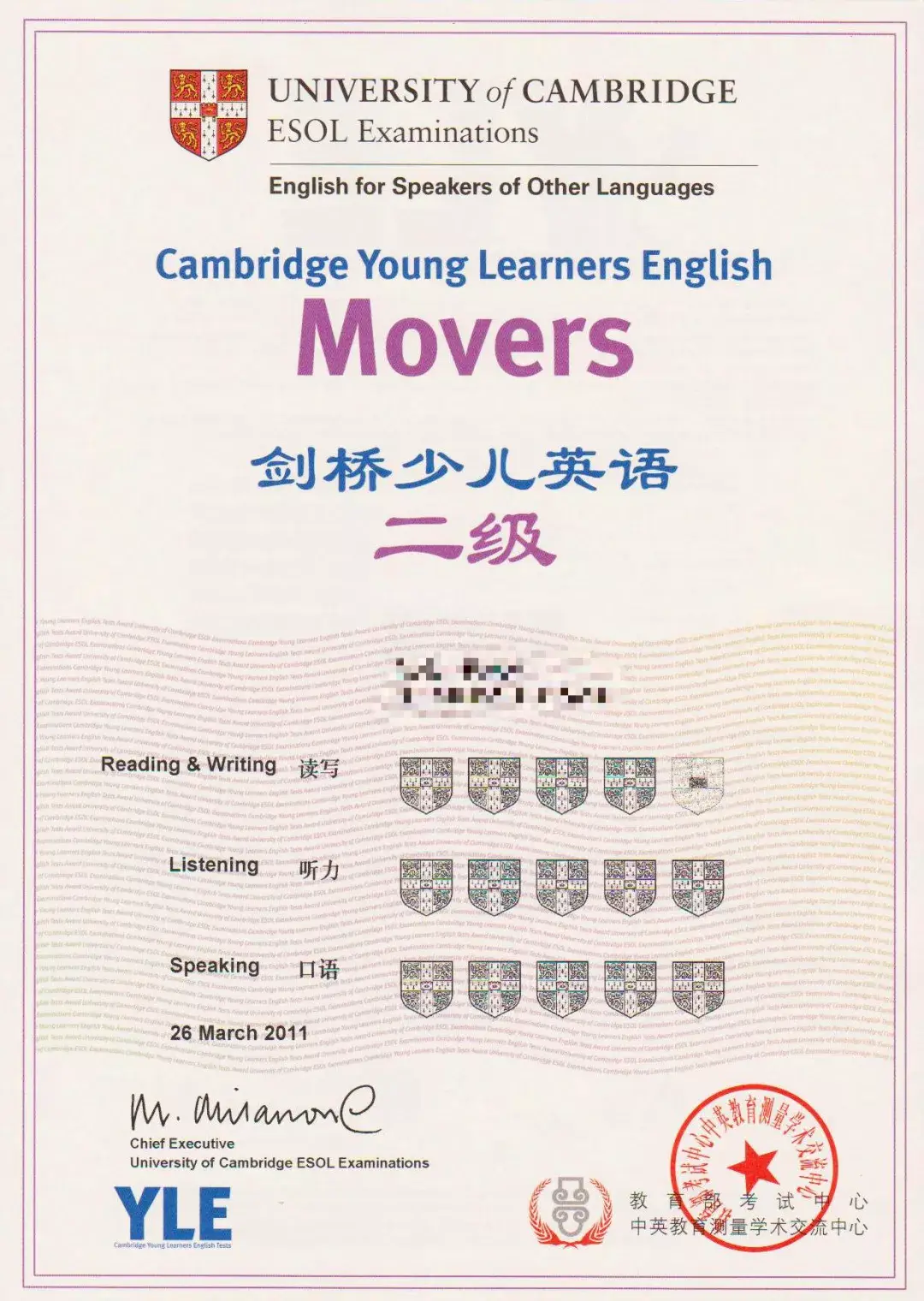 剑桥少儿英语考试(YLE)成绩不是分数制,是根据孩子得到“剑桥盾牌”的数量来检测孩子的水平(盾牌是剑桥大学的标志)满盾为最佳成绩,并无及格与不及格之分。