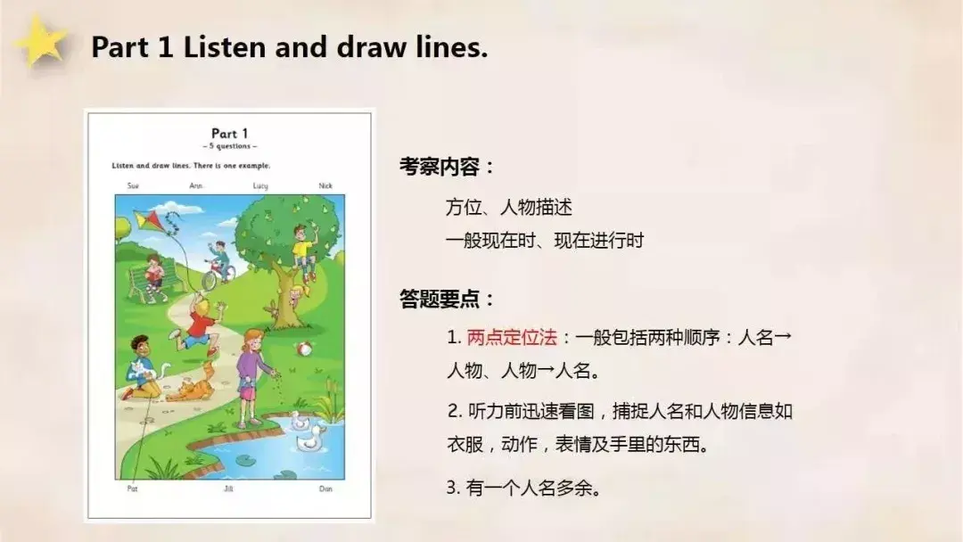 考生听简短的成人和儿童的录音对话,进行简单的操作如划线、选择、配对和填色。强调考查考生在有意义的上下文中运用语言的能力,一般为5个模块。