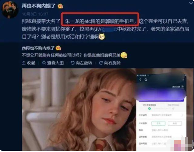 他不仅扒出朱一龙办的etc用的手机号码,是郭啸的手机号码,而且还爆出了其他的一些锤。