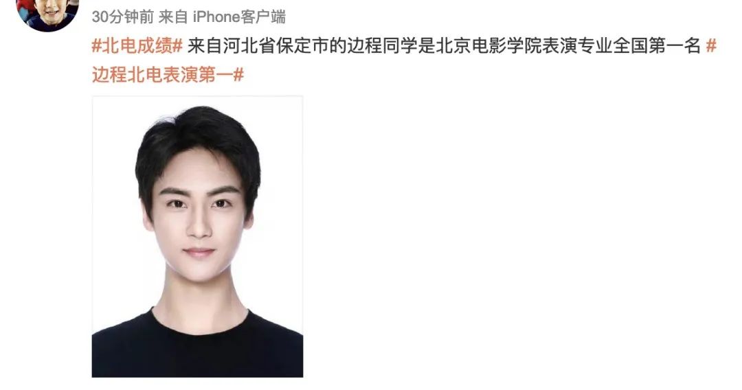 童星边程获考了北京电影学院表演专业全国第一的好成绩。