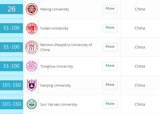 跻身中国今年世界大学社会学排名前10的大学有、北京大学(26)、香港大学(27)、香港中文大学(41)。香港大学学术声誉获得第26名,雇主声誉获得第16名; 香港中文大学学术声誉获得第39名。