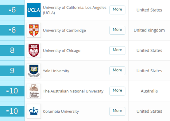 QS(Quacquarelli Symonds)发布的2019世界大学社会学排名中,哈佛大学本次在今年世界大学社会学排名夺冠, 榜单第2为牛津大学, 榜单第3为加州大学伯克利分校, 榜单第4为伦敦政治经济学院, 斯坦福大学位居第5, 加州大学洛杉矶分校位居第6, 榜单第6为剑桥大学, 榜单第8为芝加哥大学, 耶鲁大学位列第9, 澳大利亚国立大学位居第10, 哥伦比亚大学位列第10。以下为榜单前10强: