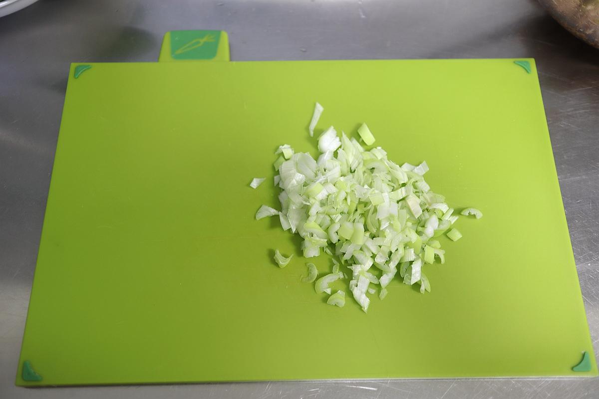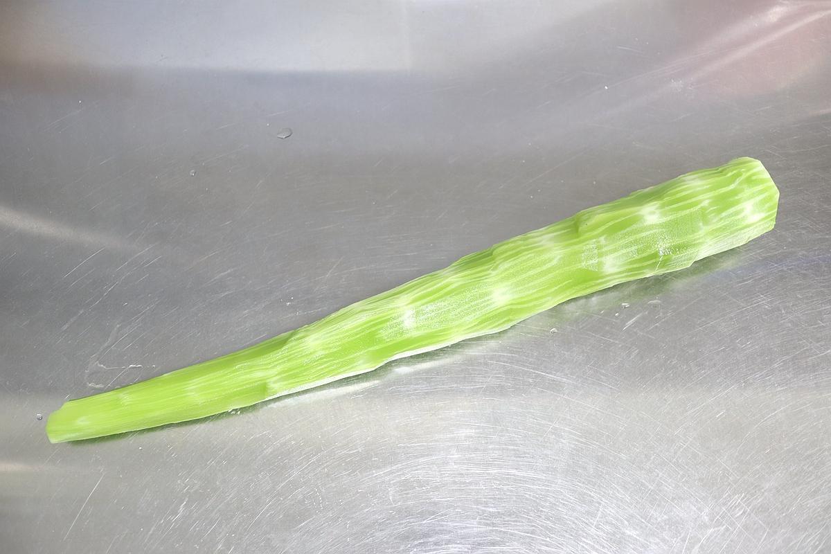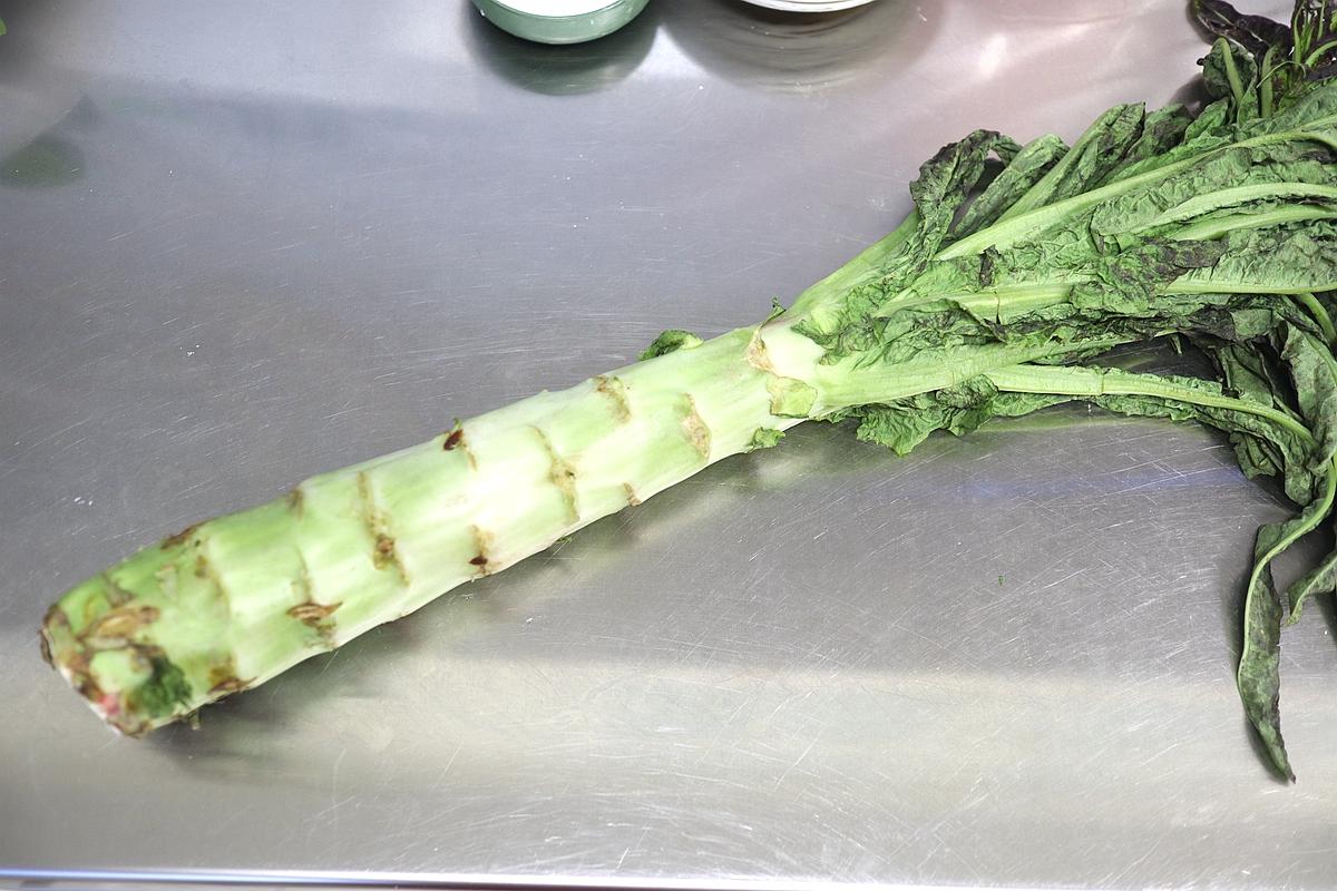 2. 揪掉嫩叶泡凉水中,茎削皮、冲洗干净;