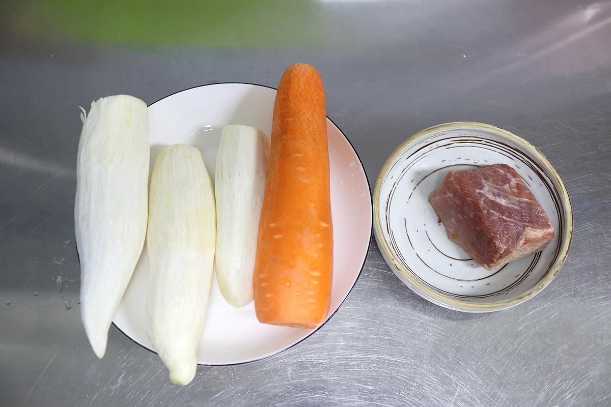 1. 茭白和胡萝卜削掉外皮,清洗干净,瘦肉一块;