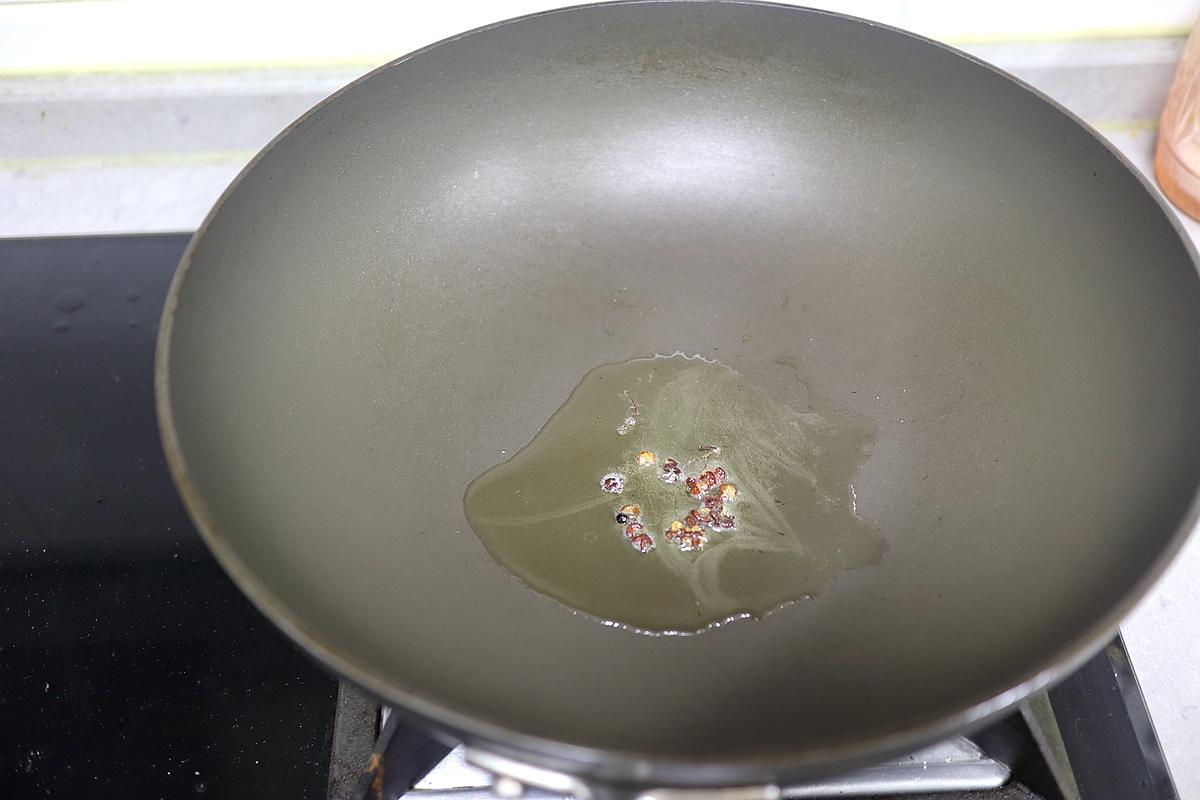 4. 凉锅凉油,把一小撮花椒煸炒出香味;