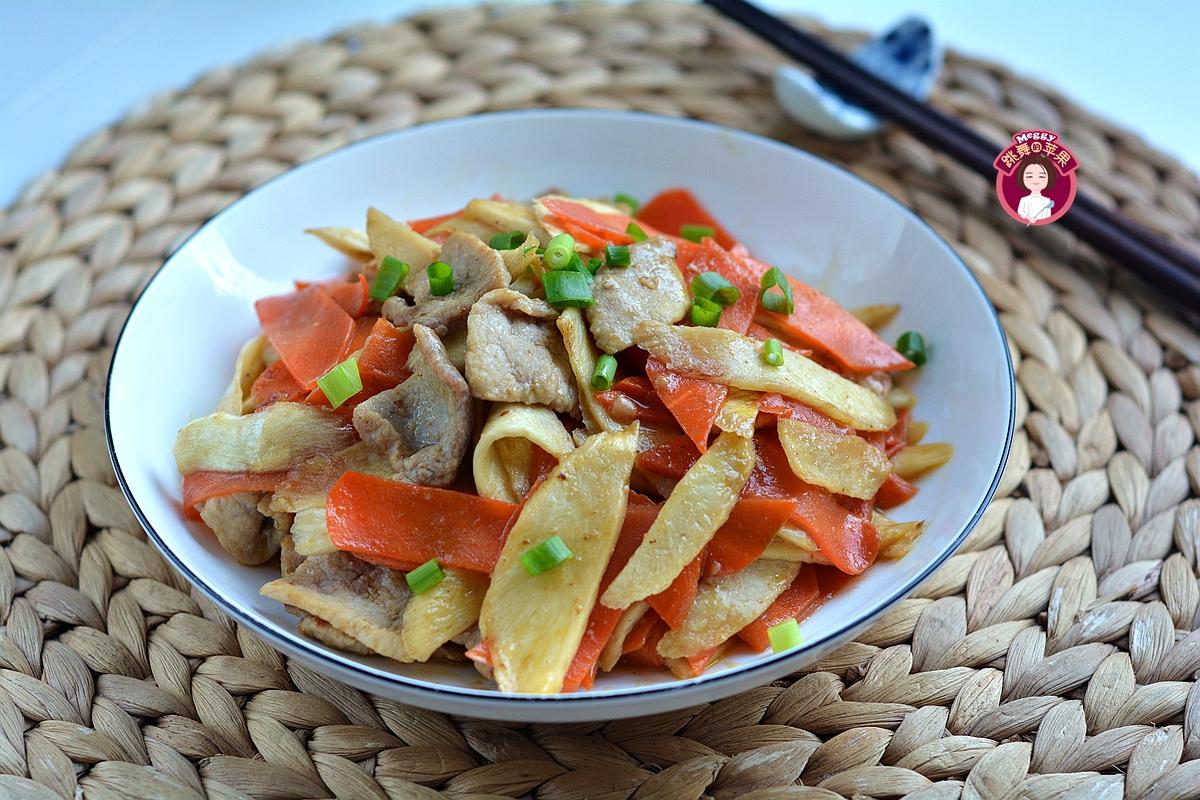 1. 肉片炒变色即放胡萝卜片,防止肉片炒得过久而变老;