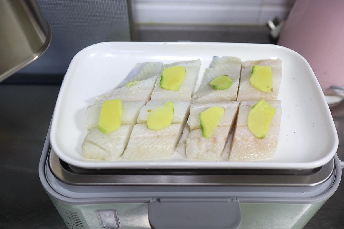 2. 切割成小块,每块上面放一片鲜姜;入冷水蒸锅,水开后蒸10分钟;
