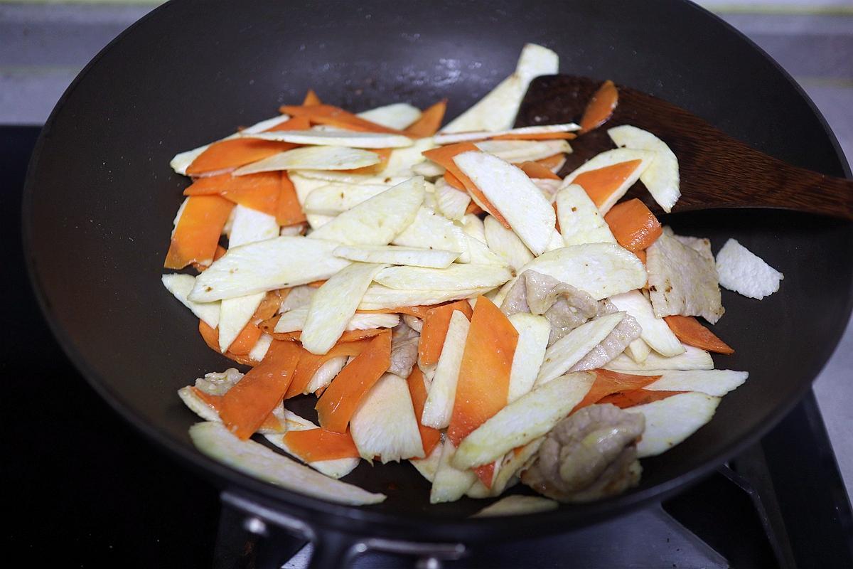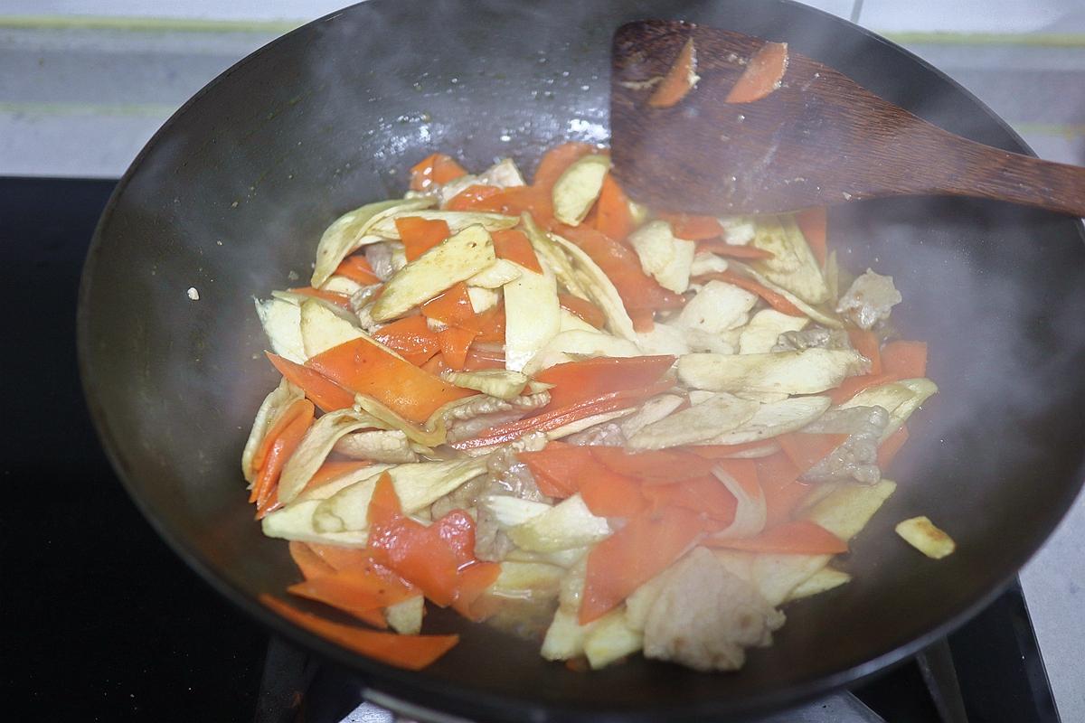 4. 热锅凉油,肉片煸炒变色加胡萝卜煸炒变软;