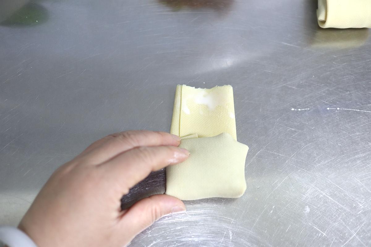 9. 继续向前折叠一下,收尾的边缘处抹淀粉浆;