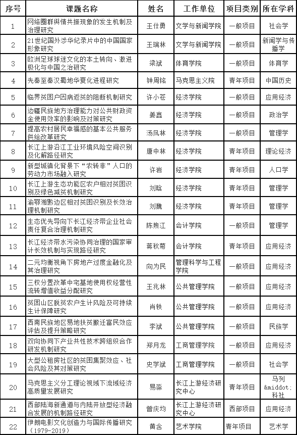 2020年10月,全国哲学社会科学规划领导小组公布了2020年国家社科基金年度项目和国家社科基金艺术学项目立项名单。2020年度重庆工商大学获得的国家社科基金项目立项资助项目数为22项。其中,一般项目13项、青年项目7项、西部项目1项、艺术学项目1项。据统计,学校年度项目立项数在全国财经类高校中位列第5,在重庆市属高校中位列第2。
