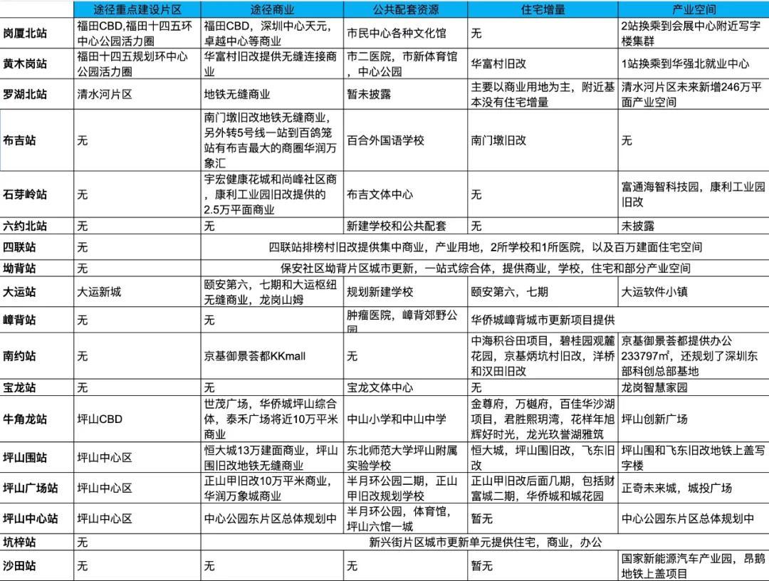 而产业空间则主要是岗厦北站和清水河站,大运站,牛角龙站的坪山CBD和坪山广场站,以及沙田新能源汽车产业基地