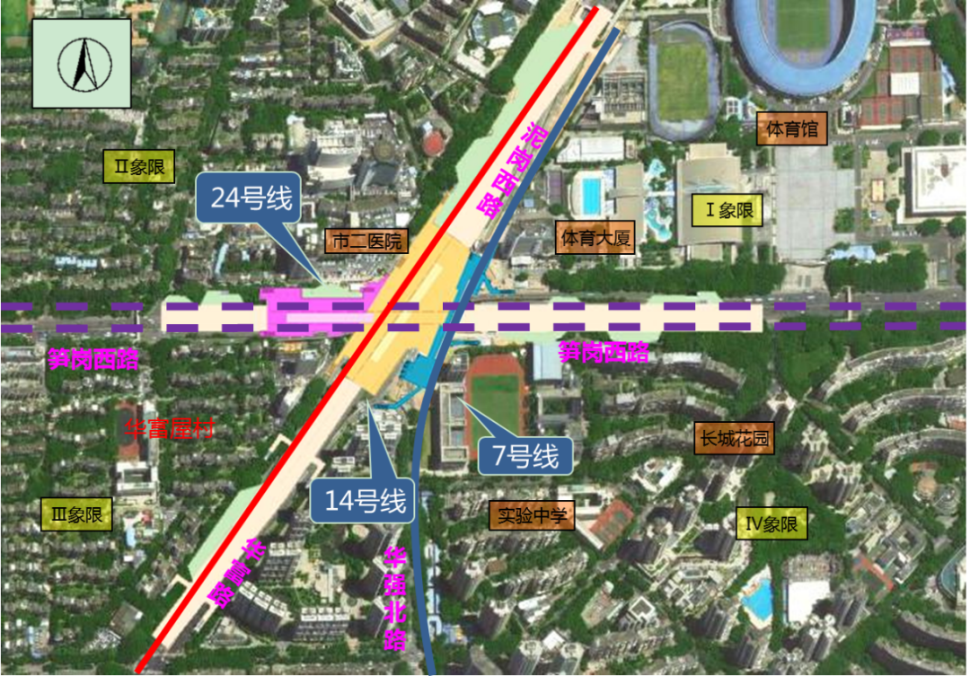 黄木岗枢纽地处深圳福田区中心区东北部,位于笋岗西路、泥岗西路、华富路、华强北路叉路口,总建筑面积约24.42万㎡。建成后,可实现7号线、14号线(在建)及24号线(规划)三线换乘。预计2022年建成。