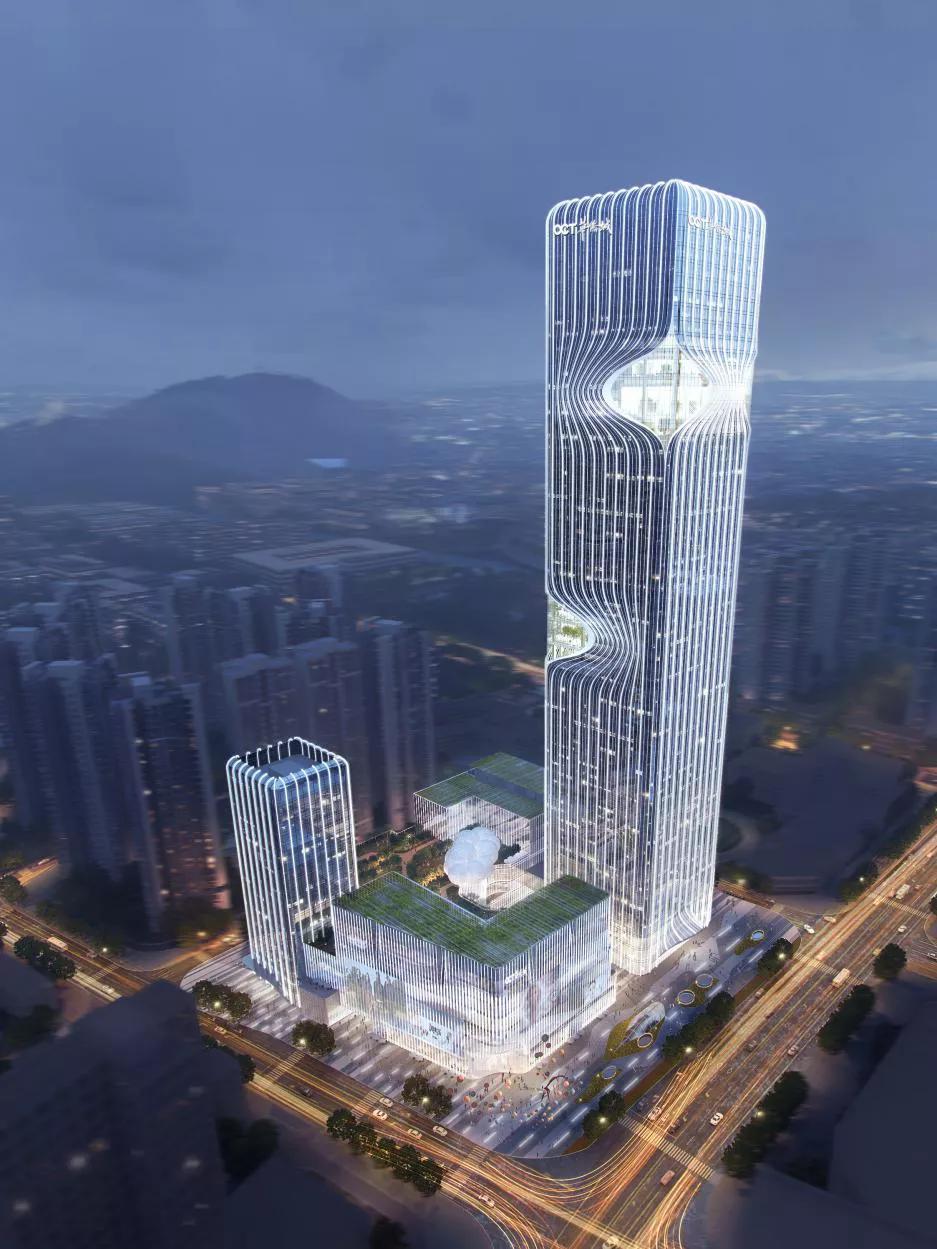华侨城坪山城市综合体,主塔楼设计高度为249米,副塔楼为87米。项目业态涵盖高端商务办公,五星级酒店、集中式商业、文化设施,同时,项目与建设中的地铁14号线沙湖站无缝衔接,该项目预计在2025年全部建成