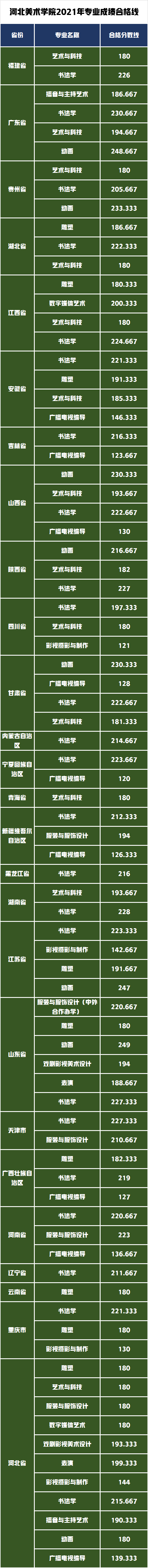 河北美术学院录取各专业考生达到学校的最低文化控制线,专业成绩达到合格线即被录取,专业成绩录取线即为专业录取最低分,各省各专业最低录取线见下表。