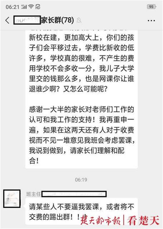 该校一些家长的聊天截屏显示,许多家长在家长群内提出意见后,被老师踢出了家长群。还有一位班主任老师在家长群里直言 " 请某些人不要逼我罢课,或者将不交费的踢出群 "。