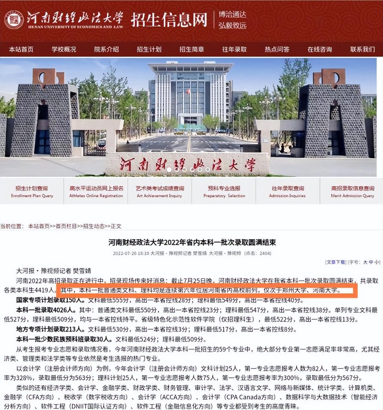 河南财经政法大学由原河南财经学院和原河南省政法管理干部学院于2010年3月合并组建而成,原来的河南财经学院就是老本科高校,因为河南财经政法大学名字实在是太霸气,所以河南财经政法大学录取分数常年仅次于河南省的郑州大学和河南大学,每年河南财经政法大学招生部门都出来宣传一下: