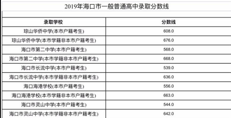 2019年海南省普通高中学校录取最低控制分数线划定如下: