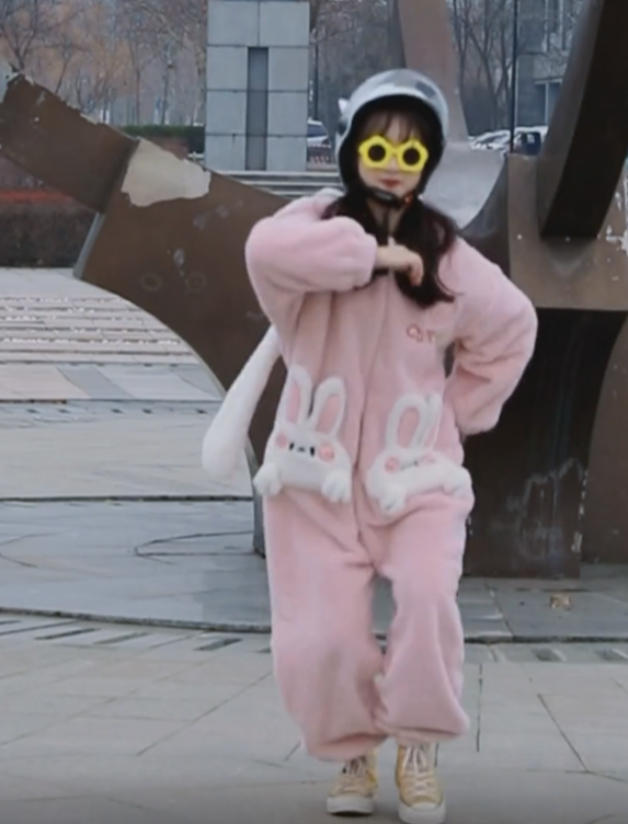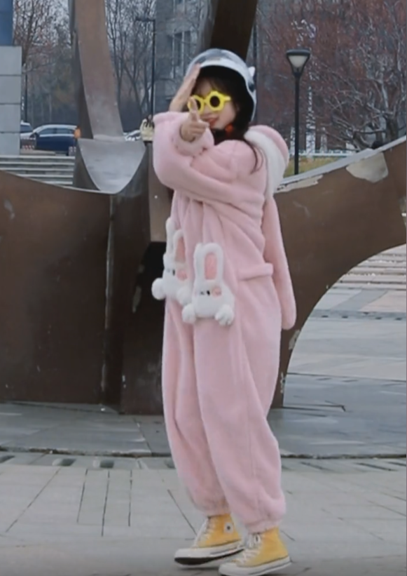 只见这位来自天津师范大学的美女大学生站在学校某广场的一个雕塑前,身穿粉红色睡衣套装,戴着头盔和黑黄相间的卡通眼睛,给人一种很可爱俏皮的感觉。