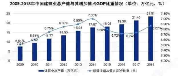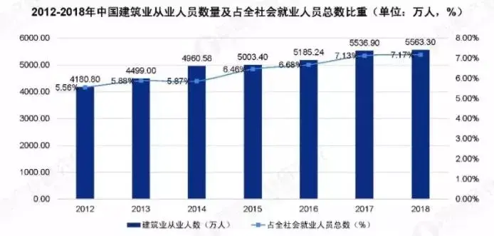 从前瞻产业研究院2019年第三季度发布的最新数据来看,建筑业作为国民经济支柱产业的地位仍为稳固;从业人员不断攀升,占全社会就业人数比7.17%。