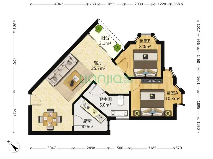 朗庭豪园探究的是一套建面约72平的2房,位于5层,通过户型图可以看出,其空间布局都不方正,每个房间都可以见到斜角,下面看看实际的观感。
