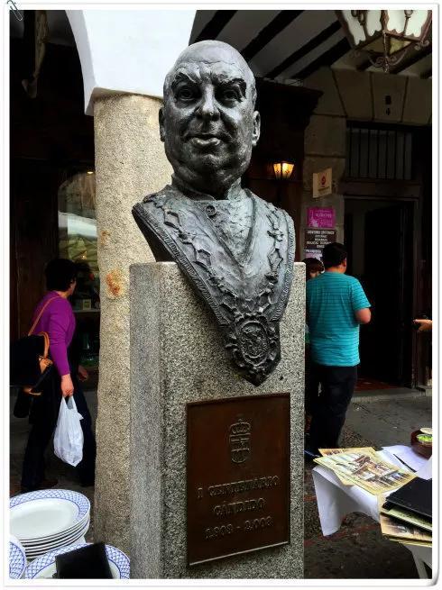 距离马德里80多公里处的塞戈维亚,是个有2000多年历史的古城。在城市的街心花园里竖立着一座雕像:一位身材魁梧的老人右手举着盘子,面前的桌上摆着4只烤乳猪。这位老人就是名扬西班牙的大厨—坎迪多。说到这座雕像的来历还有一段故事:在西班牙西北部地区,烤乳猪向来是一道响当当的菜肴,而坎迪多做的烤乳猪更是皮脆肉嫩、奇香无比。为了向食客展示乳猪的酥脆,坎迪多特意在上菜时用盘子代替刀具切割猪肉。后来,为纪念这位烤乳猪高厨,有些人计划将其成功经验写成书籍,当地人还专门以他举盘切肉的形象制作了一座雕像。如今,这座雕像已经成为塞戈维亚城的著名象征。