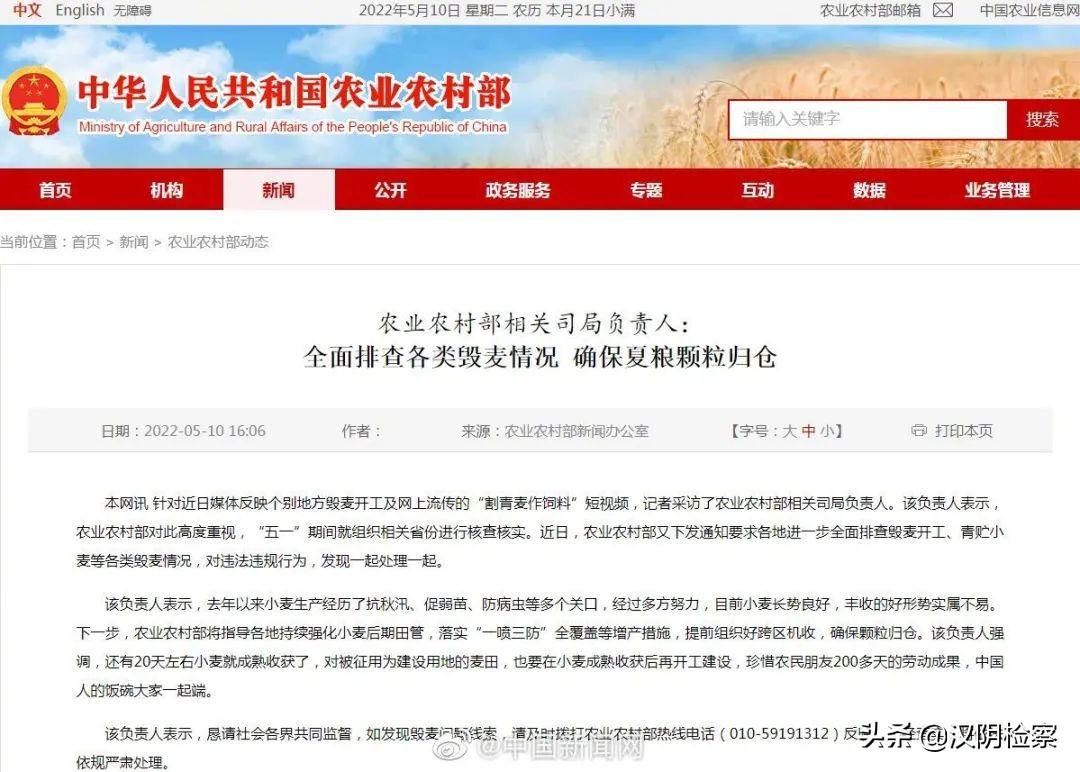 ▲据农业农村部网站消息,针对近日媒体反映个别地方毁麦开工及网上流传的“割青麦作饲料”短视频,农业农村部相关司局负责人表示,农业农村部对此高度重视,“五一”期间就组织相关省份进行核查核实。近日,又下发通知要求各地进一步全面排查毁麦开工、青贮小麦等各类毁麦情况,对违法违规行为,发现一起处理一起。如发现毁麦问题线索,请及时拨打农业农村部热线电话(010-59191312)反映。