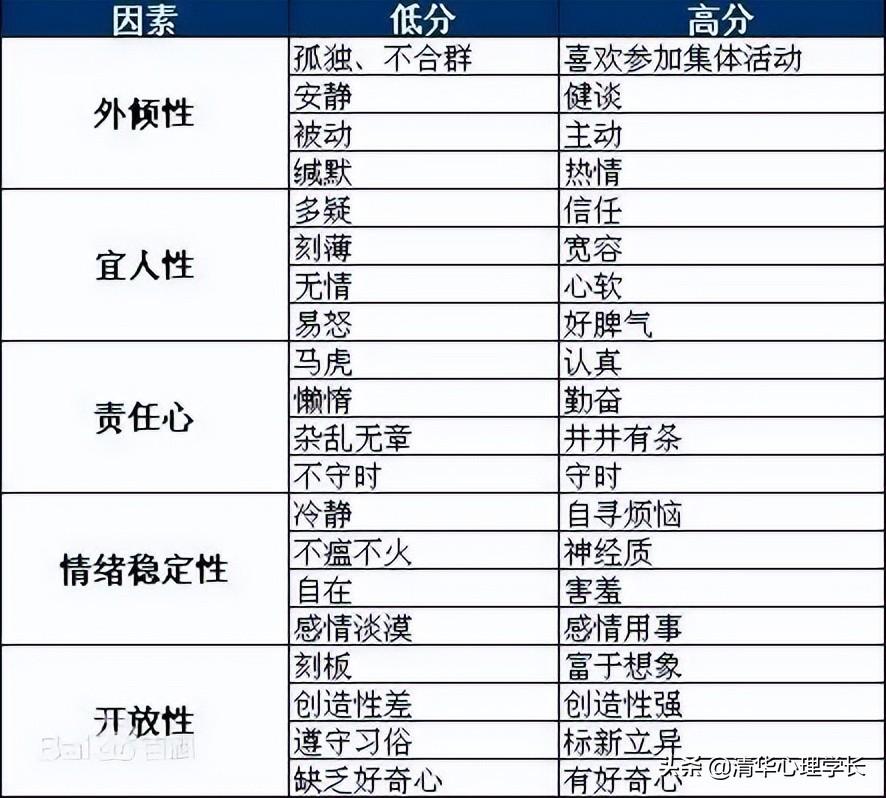 心理学家们在对人格进行因素分析时,有了惊人的并且相当一致的发现,有五个因素在不同方法的研究中都是特别突出,以致研究者们称之为“大五”,它们就是:内-外向性、宜人性、谨慎性、神经质(情绪稳定性)、对经验的开放性。