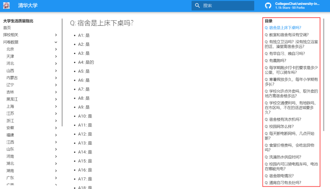 每个大学下都有25个问题,比如宿舍是上床下桌吗?教室和宿舍是否有空调?是否是独立卫浴?有早晚自习吗?是否允许点外卖?校园网怎么样?食堂饭菜和价格怎么样?还有限电情况和通宵自习去处等等,基本囊括咱们大学生活的方方面面。