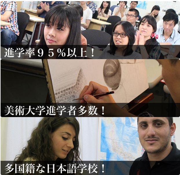 学校设有升入著名的美术学校的升学辅导班。学校与美术大学升学专业指导名牌美术学院合作,由专业教师进行美术技术指导,由学校提供日本语指导的双重教学体系。学校还会定期邀请各个美术大学的老师来学校进行作品的评价和指导。
