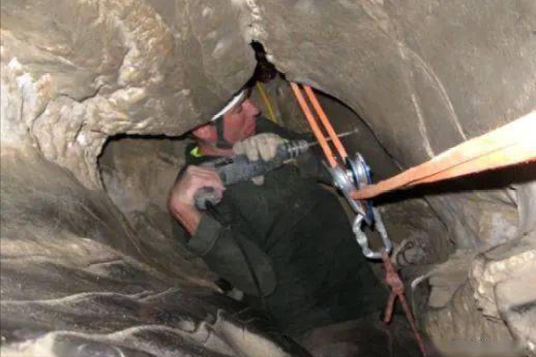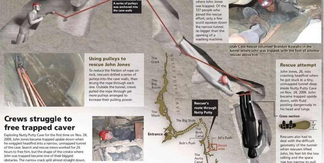 在救援人员的努力下,约翰被拉出来了一点高度,但是,由于约翰属于垂直的姿势,并且头部朝下,在接下来的救援中,还是无法将其身体完全拉出垂直的通道。