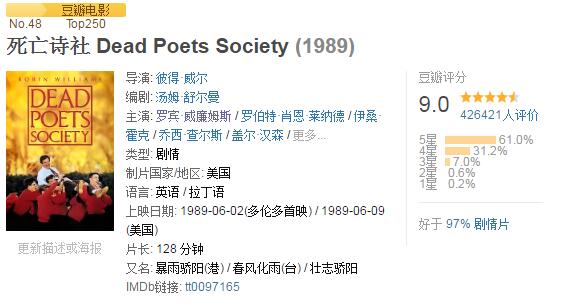 就像我看到电影名字时的表情一样,我相信很多人都会望而却步,《死亡诗社》的中文直译名让很多人错过了这部佳片。台湾地区的译名是《春风化雨》,我认为更为贴切。