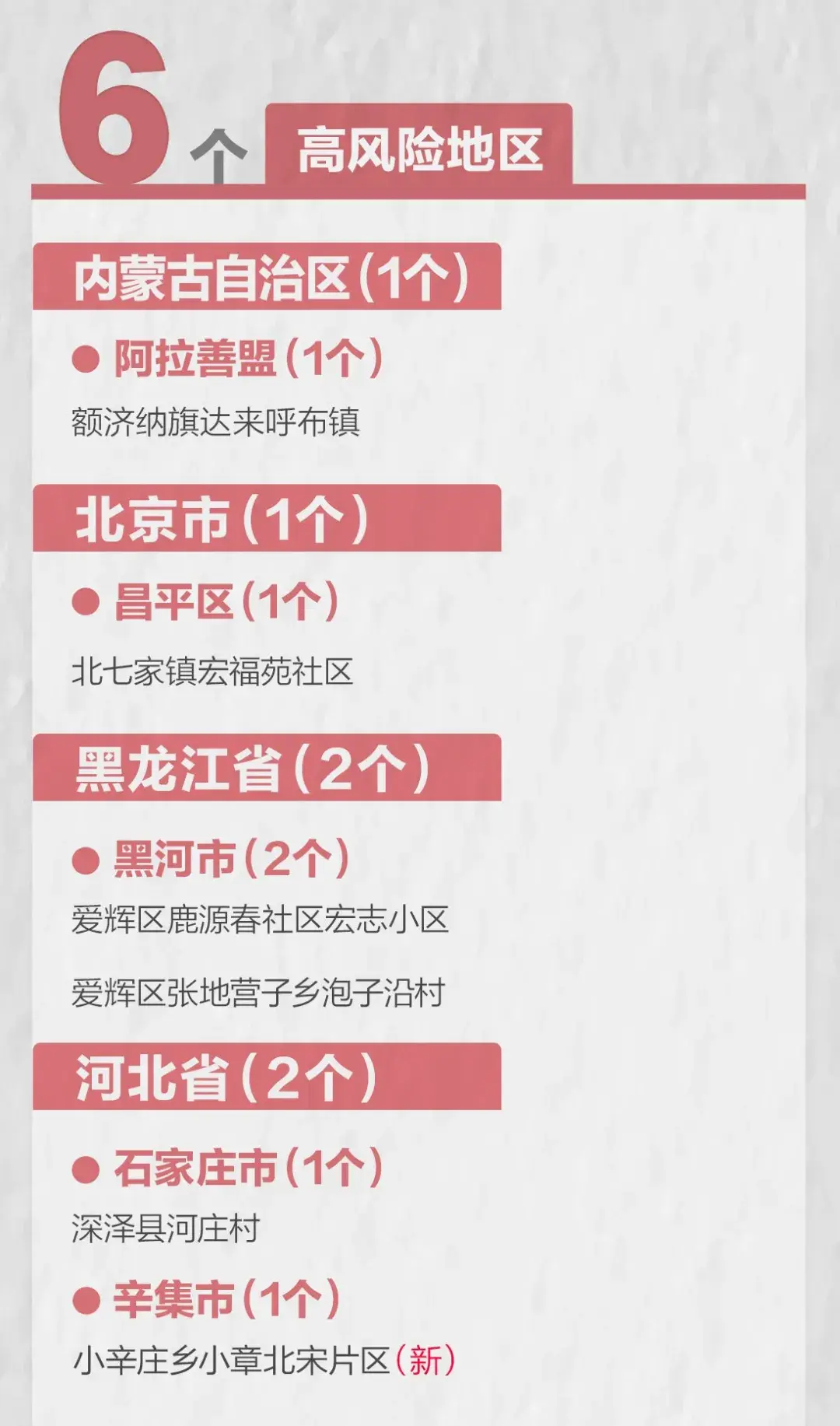 根据国务院应对新型冠状病毒肺炎疫情联防联控机制关于科学划分、精准防控等工作要求,自2021年11月8日起,辛集市小辛庄乡小章北宋片区调整为高风险地区。