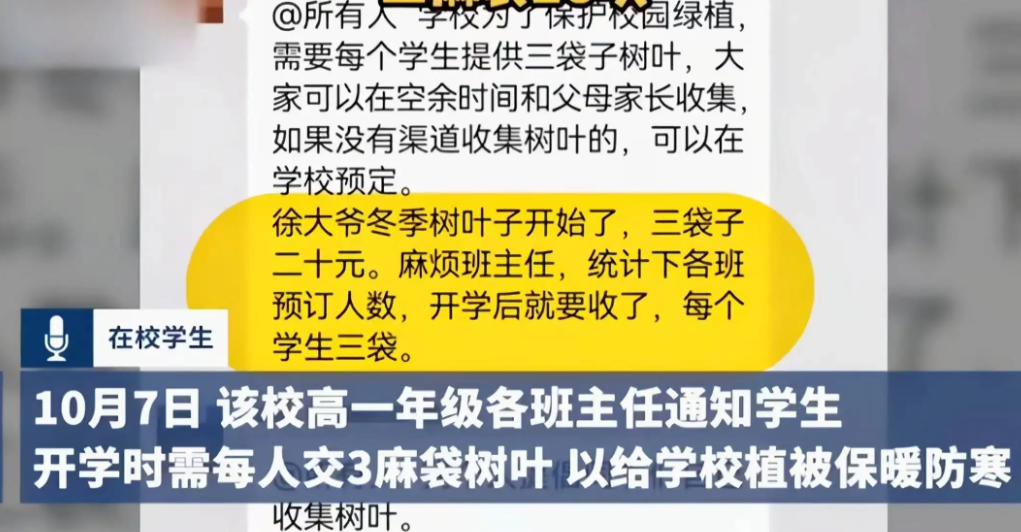 黑龙江大庆某高中的一名干事在学校高一群里发了一则消息,并@所有人说学校为了保护校内的绿植,需要每名学生给学生3袋子树叶,还呼吁学生和家长一起收集树叶。