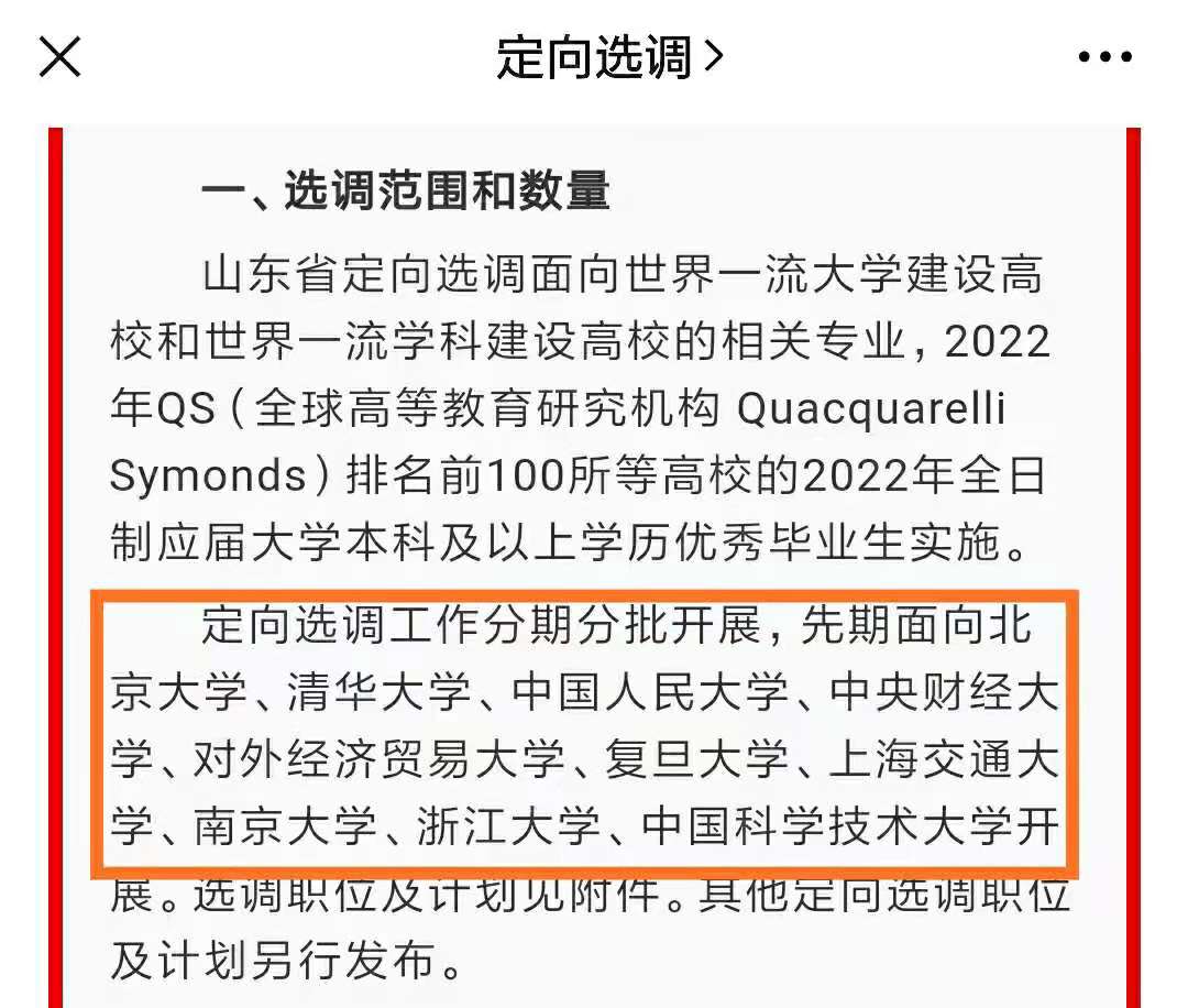 根据山东省相关部门提供的信息,山东省定向选调生面向世界一流大学建设高校以及世界一流学科建设高校相关专业,2022年QS排名前100所高校的毕业生开放。这就是山东定向选调生的招纳范畴。