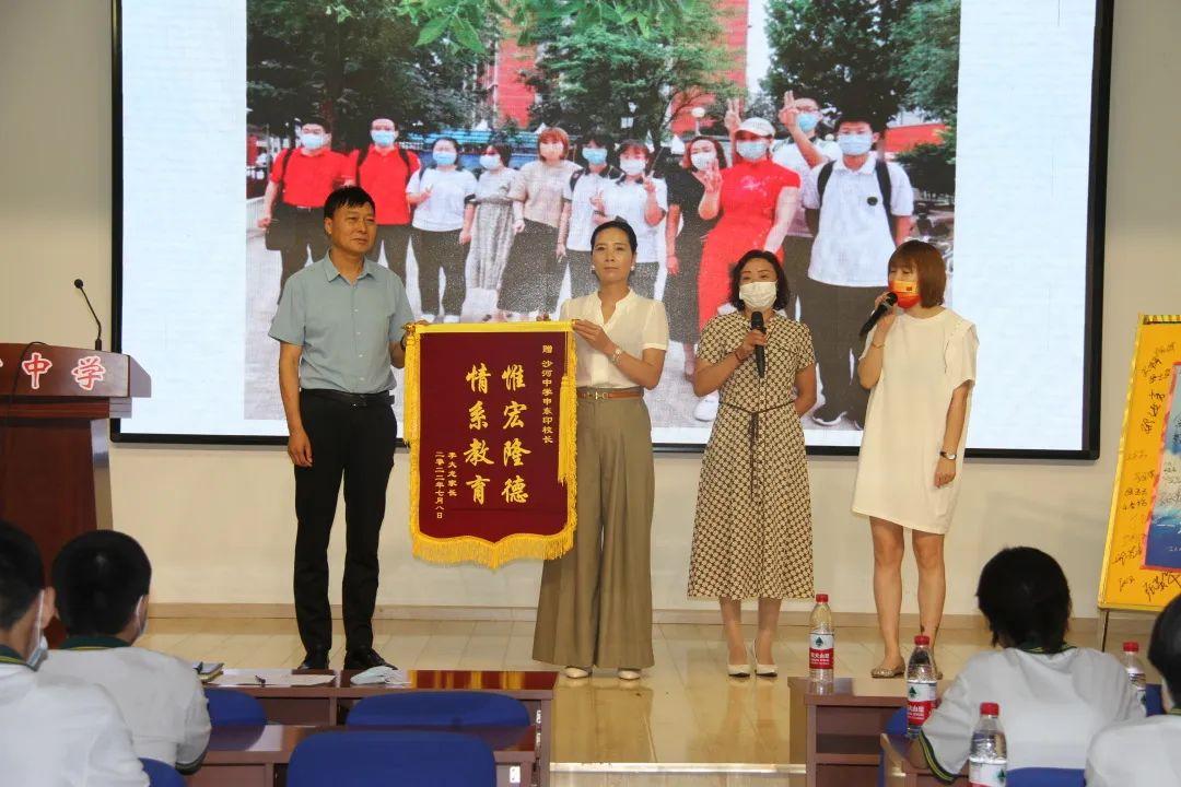 李大龙的母亲作为家长代表为申东印校长赠送了锦旗,表达对申校长的感谢。毕扬的母亲以及聂嘉凝的母亲作为家长代表对学校及所有教过孩子的老师们一并表示感谢,并为他们送上了鲜花和蛋糕。