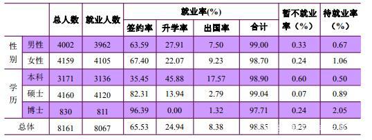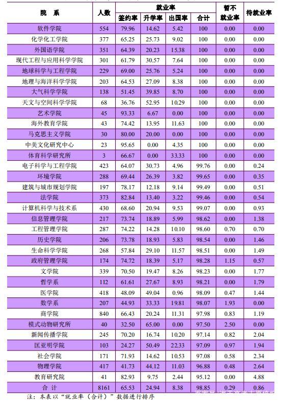 截止2020年11月30日,2020年南京大学毕业生就业率为98.85%。其中本科生就业率为98.90%,硕士毕业生就业率为99.04%,博士毕业生就业率吧为97.71%。